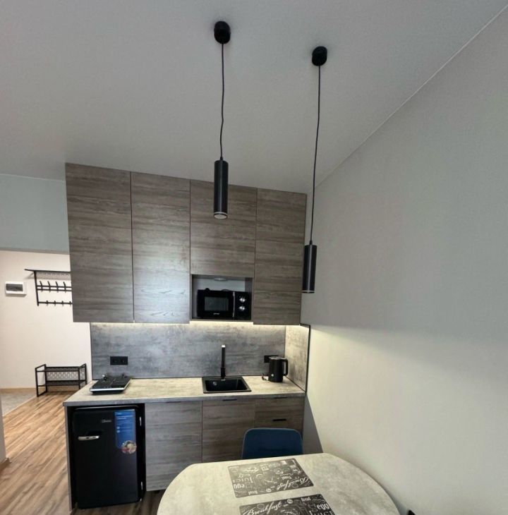 Вся техника и мебель в отличном состоянии, Из мебели: кухонный гарнитур, стол со тульями, диван. Из мебели, плита настольная 1 комфорочная, небольшой холодильник, чайник, микроволновка, кондиционер, стиральная машинка, телевизор, утюг.
