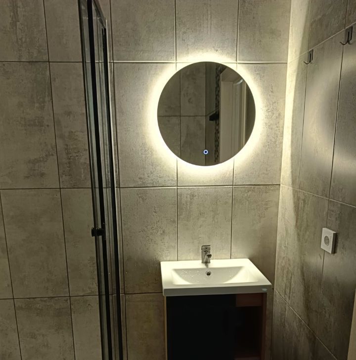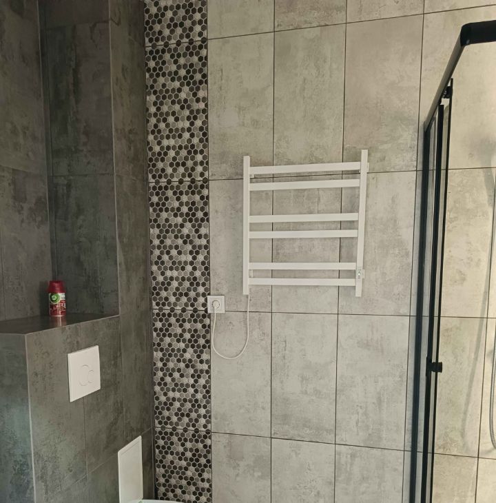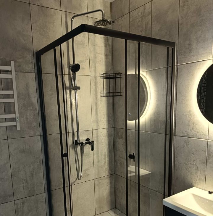 Ванная комната выполнена в современном стиле с душевой кабиной и качественной сантехникой.
