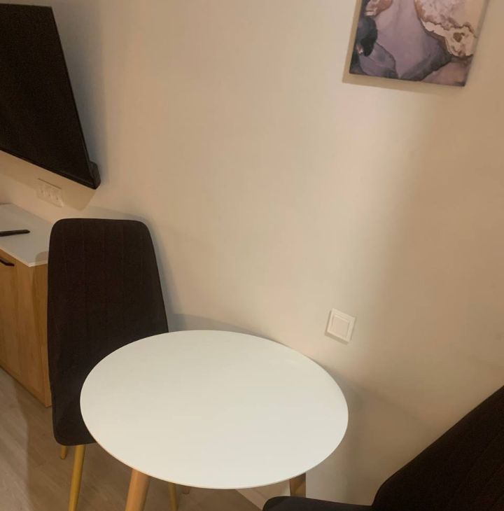 Интерьер студии выполнен в современном стиле. В квартире есть вся необходимая мебель как в комнате, так и на кухне. Из техники — кондиционер, холодильник, посудомоечная машина, телевизор и стиральная машина. Санузел совмещённый, оборудован душевой кабиной. Интернет проведён, поэтому можно всегда оставаться на связи.