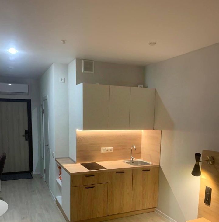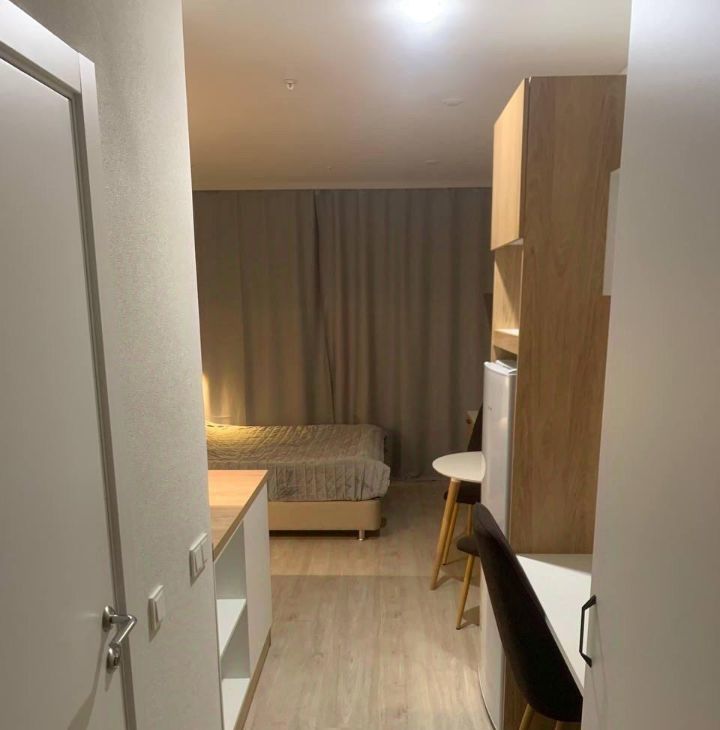 Сдаётся уютная студия в апартаментах с евроремонтом, расположенная на 12-м этаже 25-этажного дома. Общая площадь — 20,2 кв. м, жилая — 16 кв. м. Окна выходят во двор, что обеспечивает тишину и комфорт. В доме есть 4 пассажирских и 2 грузовых лифта, а также подземная парковка, что особенно удобно для автомобилистов.