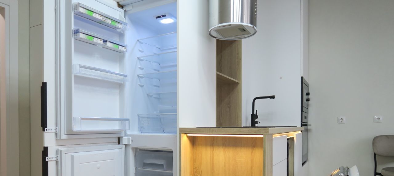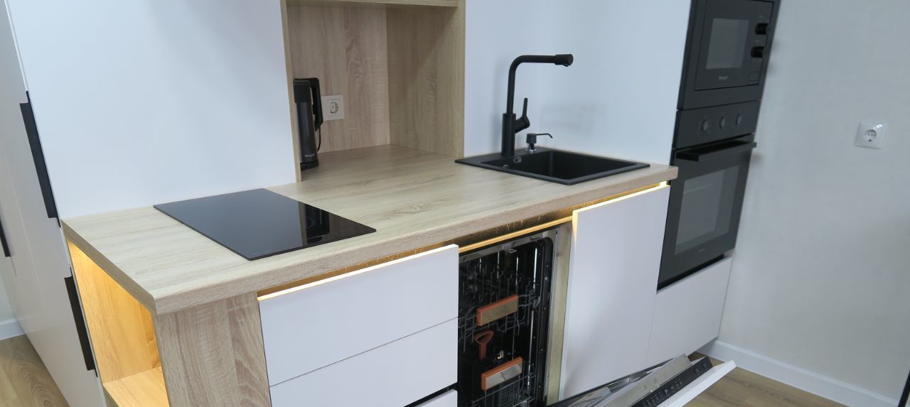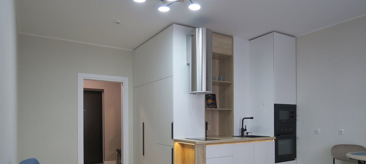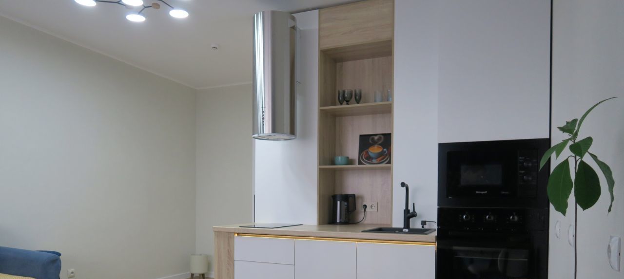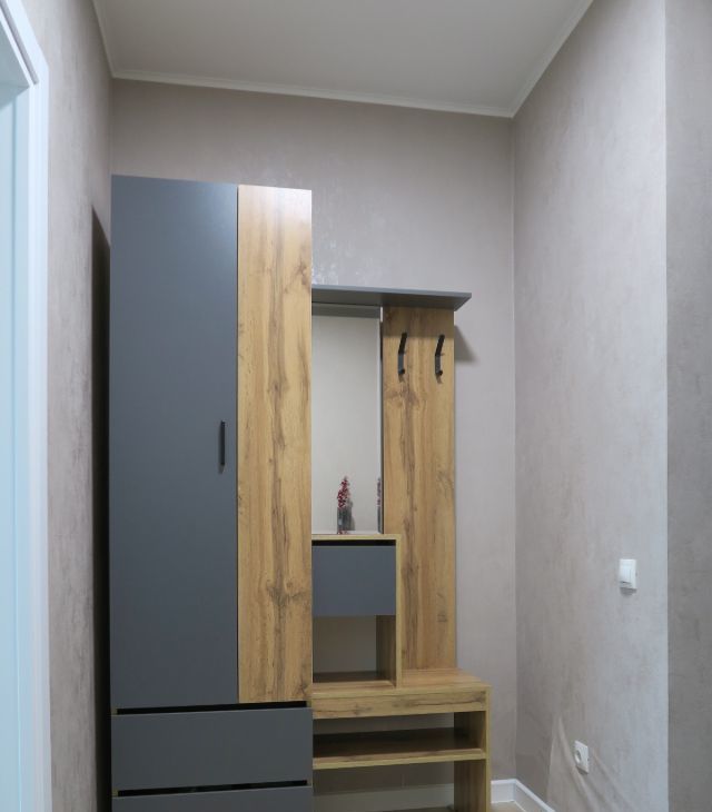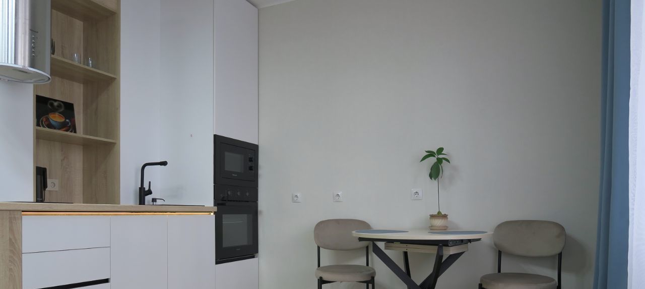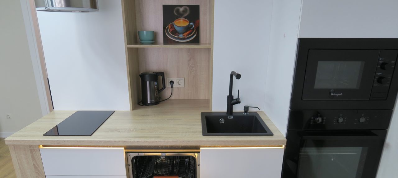 В квартире сделан качественный евроремонт. Всё необходимое для комфортного проживания уже есть: качественная мебель представленная на фото - вместительный встроенный шкаф гармонично организован в комнате, в едином стиле с кухонным гарнитуром и другая мебель; современная техника — встроенный холодильник, посудомоечная машина, духовой шкаф и микроволновая печь, электрическая вытяжка, стиральная машина с функцией сушки белья, электрический чайник, Wi-fi роутер. Приобретение телевизора в квартиру обсуждается, как других предметов. Санузел совмещенный, оборудован глубокой ванной и качественным санфаянсом. Застекленная лоджия добавляет дополнительное пространство для отдыха или хранения вещей. В квартире всё новое и она сдаётся впервые!