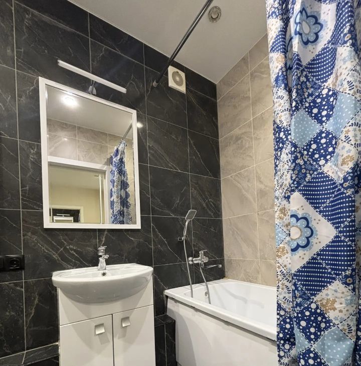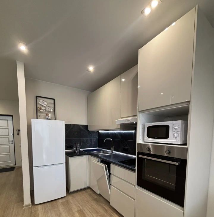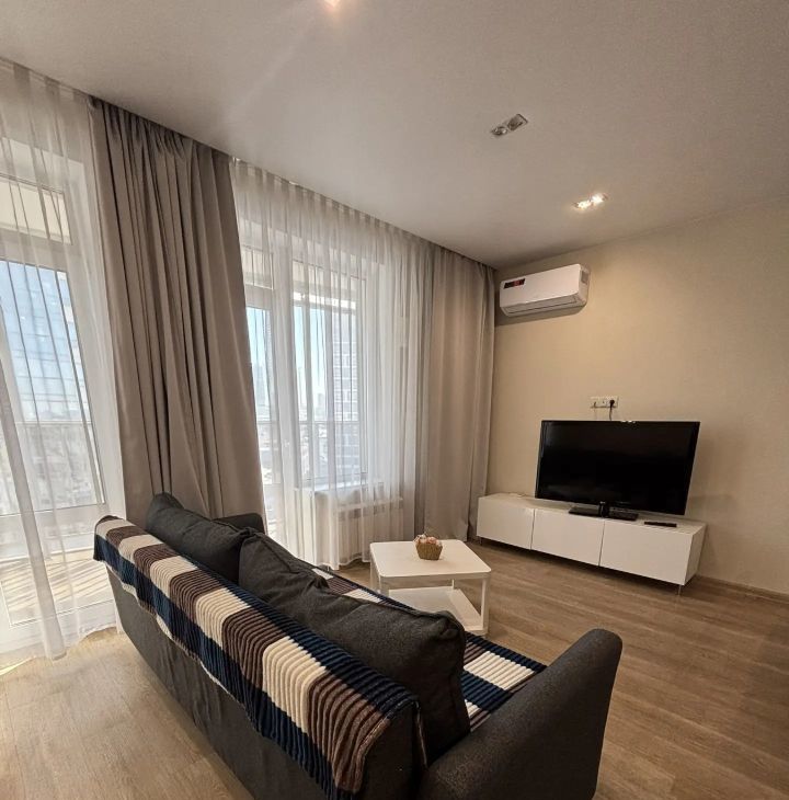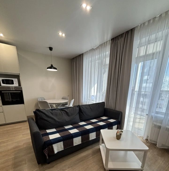 В квартире сделан качественный евроремонт. Здесь есть все необходимое для комфортной жизни: новая мебель на кухне и в комнате, современная техника — кондиционер, холодильник, посудомоечная машина, телевизор и стиральная машина. Санузел совмещенный, оборудован ванной.