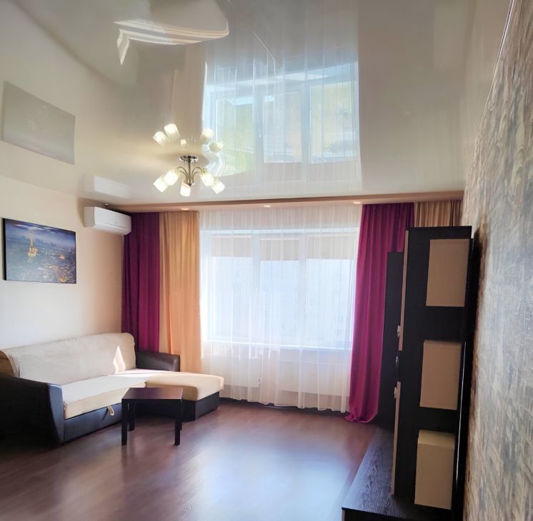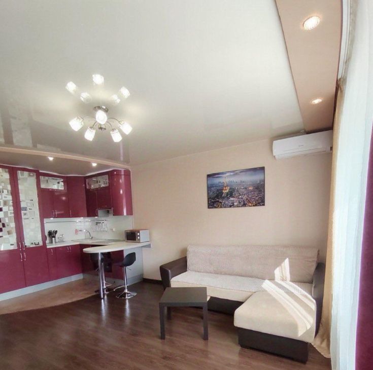 Квартира после евроремонта, поэтому всё выглядит свежо и аккуратно. Просторная комната объединена с кухней, что создаёт ощущение простора. На кухне и в комнате есть необходимая мебель. Из техники установлены кондиционер, холодильник и стиральная машина, поэтому можно сразу же заселиться и комфортно жить. В совмещённом санузле есть ванна. Окна выходят на улицу, открывая приятный вид.