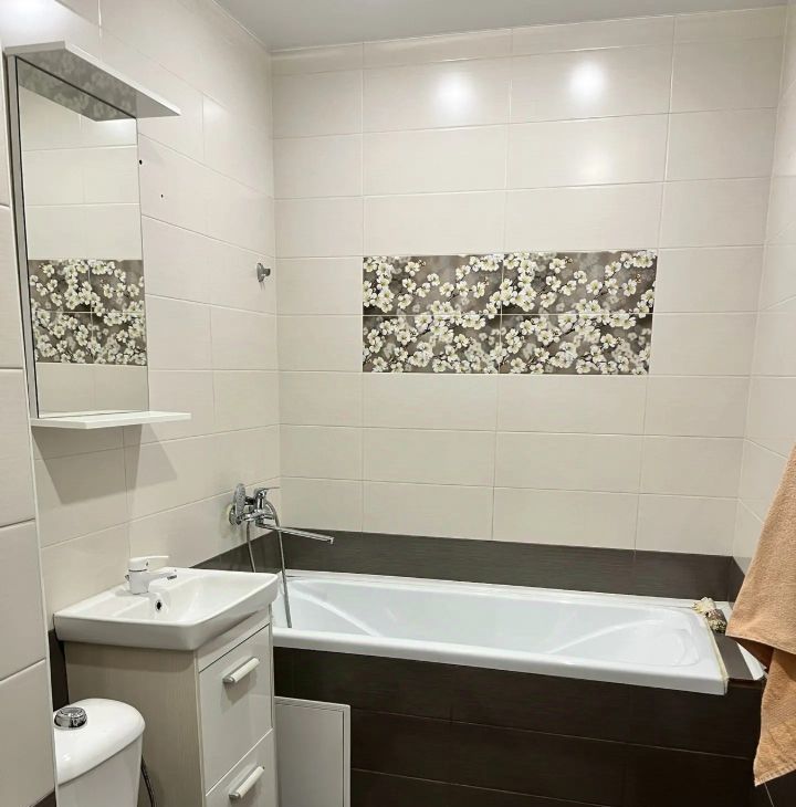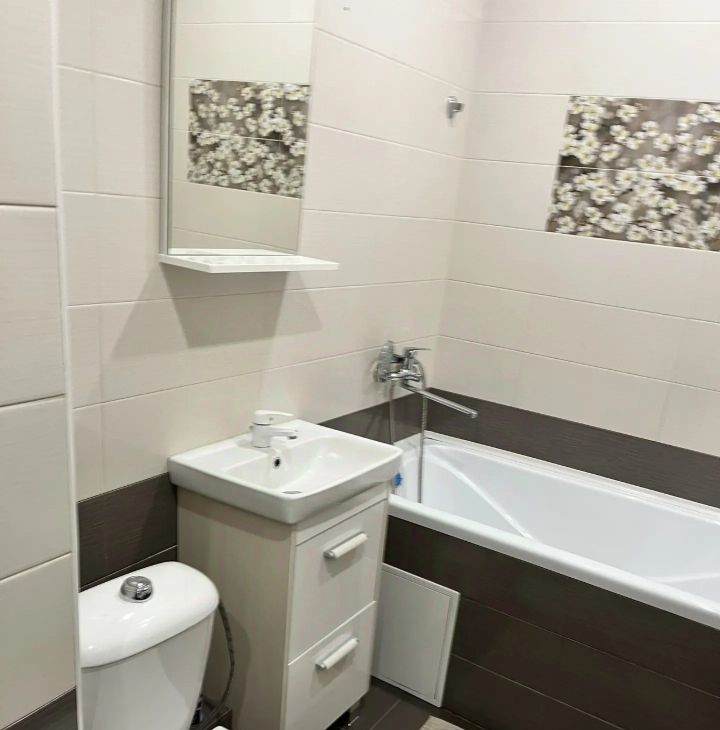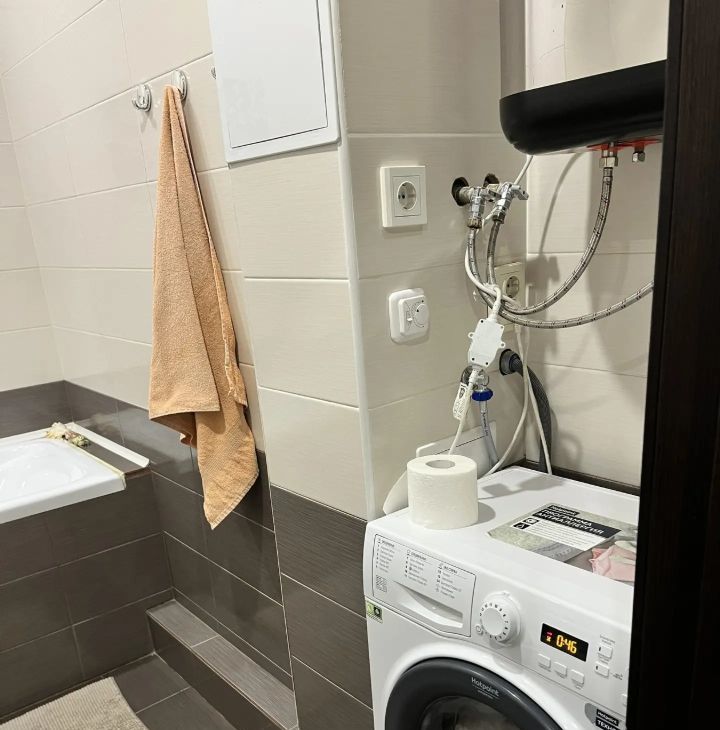 В квартире сделан свежий евроремонт, она полностью меблирована. На кухне и в комнате есть необходимая мебель, поэтому можно сразу заехать без лишних хлопот. Из техники установлены кондиционер, холодильник, телевизор,водонагреватель и стиральная машина. Санузел совмещенный, с полноценной ванной, что добавляет комфорта жильцам.