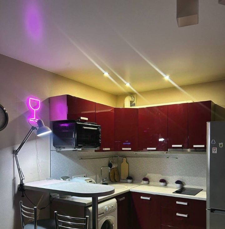 Из бытовой техники: холодильник, варочная панель, духовой шкаф, стиральная машинка, чайник, телевизор. Из мебели: диван, кухонный гарнитур, барная стойка, шкафы, тумбочки, стулья и т.д. Все новое.