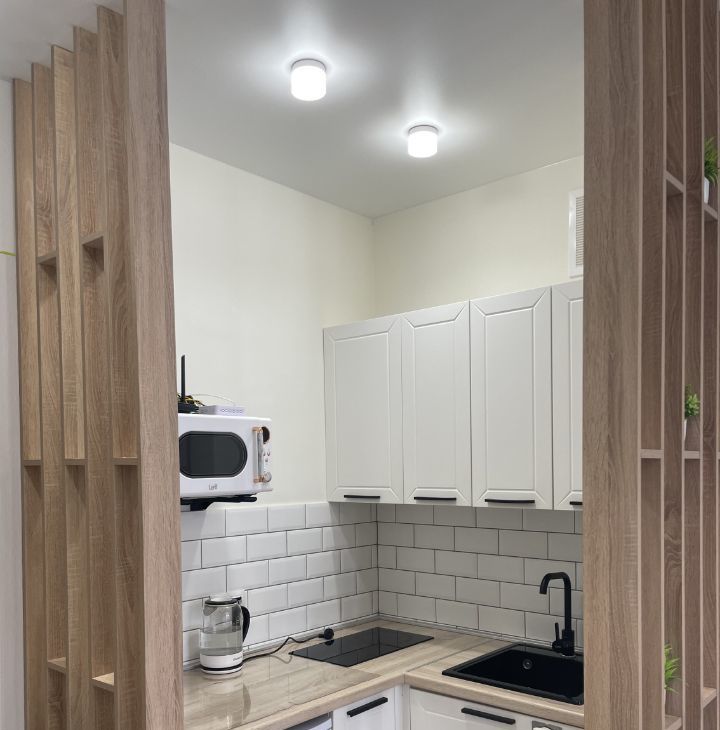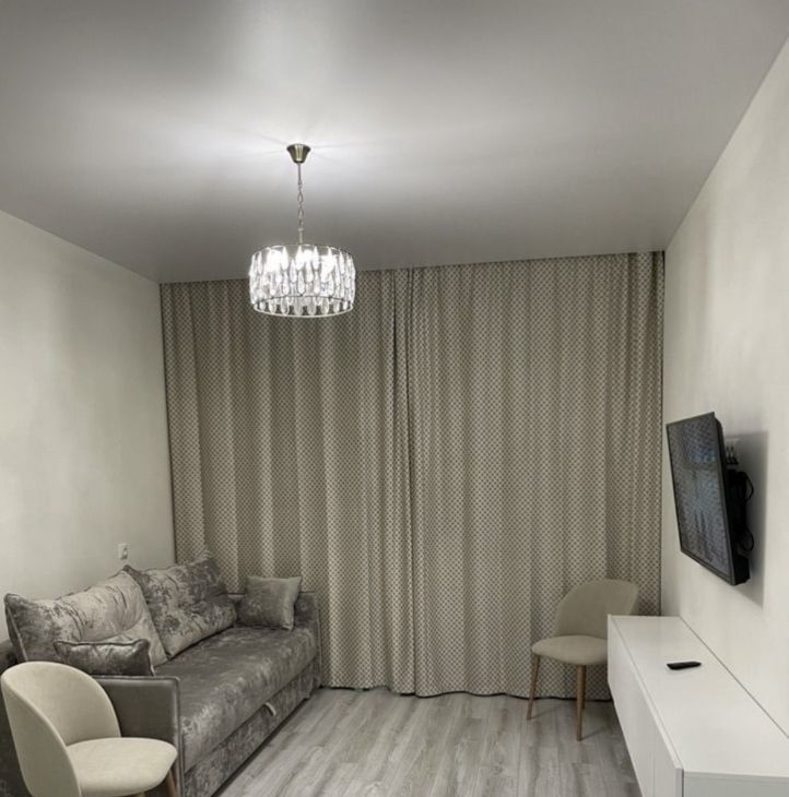 В квартире сделан качественный ремонт в светлых тонах. Пространство продумано, есть вся необходимая мебель и техника.