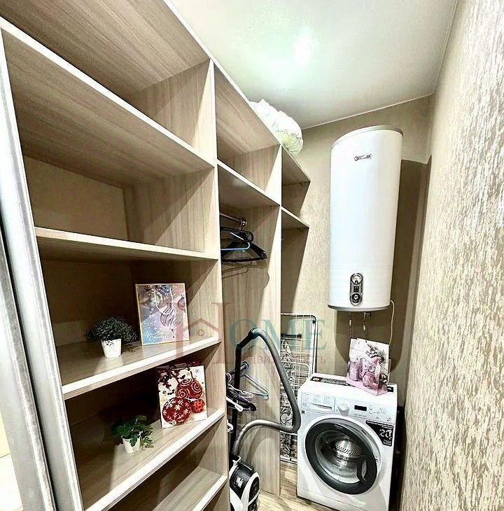 В прихожей предусмотрена гардеробная для удобного размещения вещей. Есть стиральная машина, водонагреватель. Также имеется сушилка для вещей и гладильная доска.